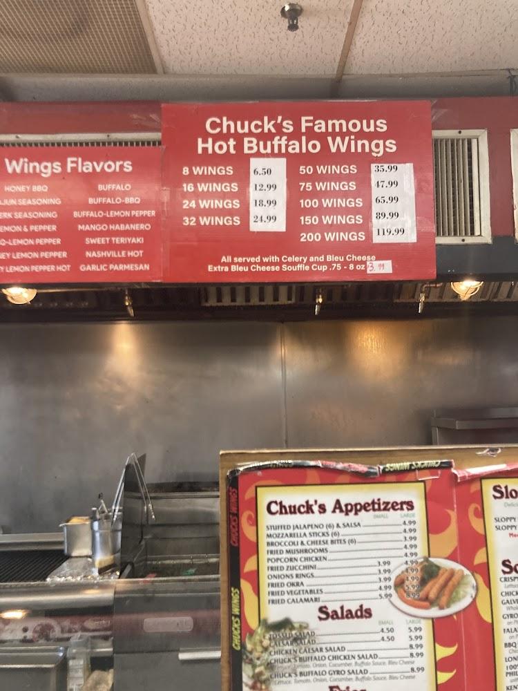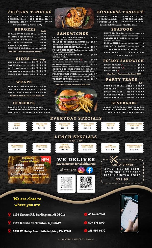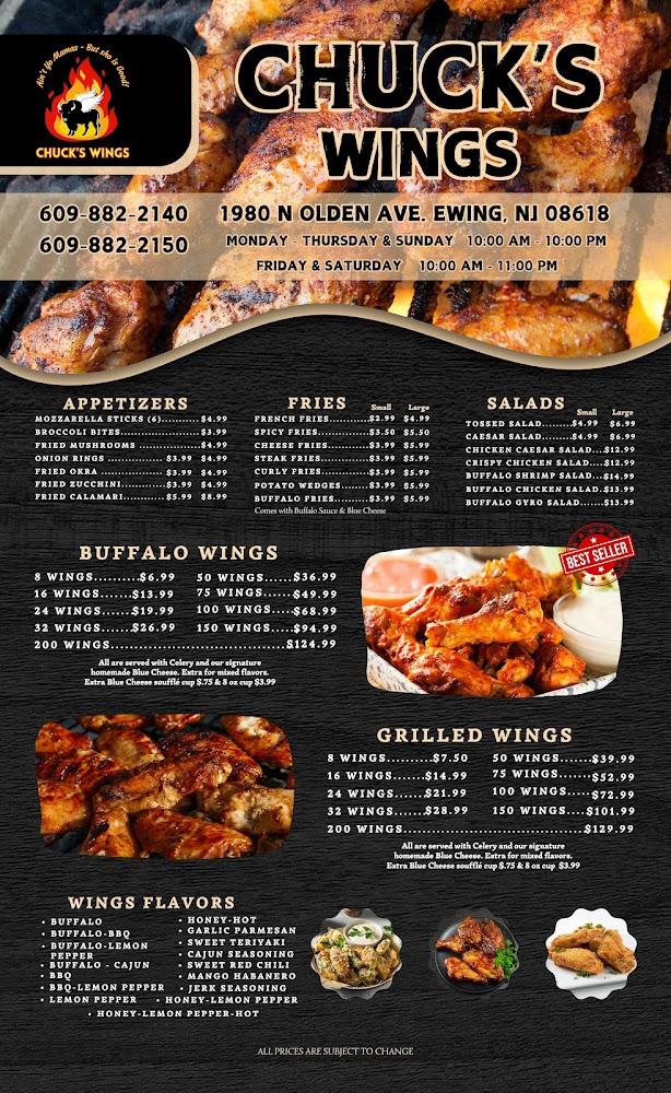 Welcome to Chuck's Wings - Ewing, your ultimate destination for the best Buffalo wings on the East Coast since 1990! Located at 1980 N Olden Ave, Trenton, NJ, we pride ourselves on our 14 unique sauces that cater to every palate. In addition to our famous wings, enjoy our mouthwatering Chicken Tenders, Beef Ribs, Seafood, Fries, Burgers, and Cheesesteaks. With options for dine-in, takeout, and delivery, we ensure a speedy service in a relaxed atmosphere perfect for students and groups alike. Experience traditional flavors in a wheelchair-accessible setting. Join us today for an unforgettable dining experience!